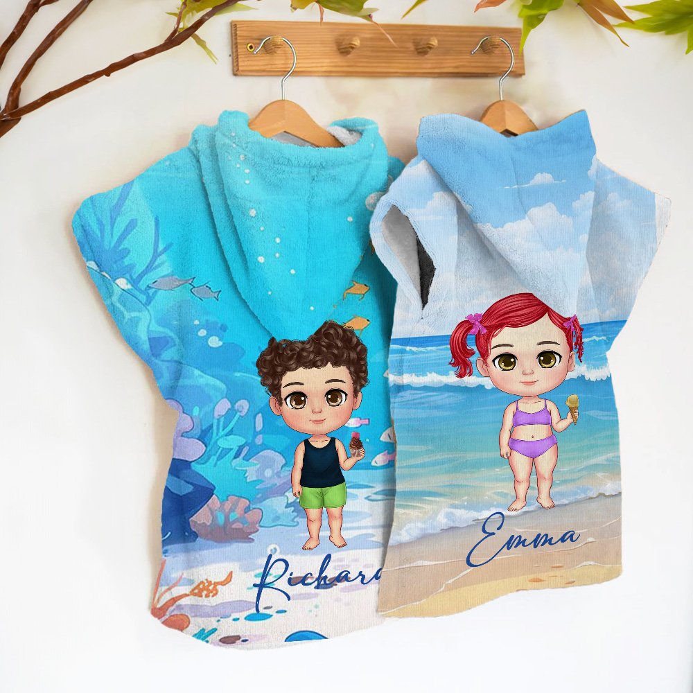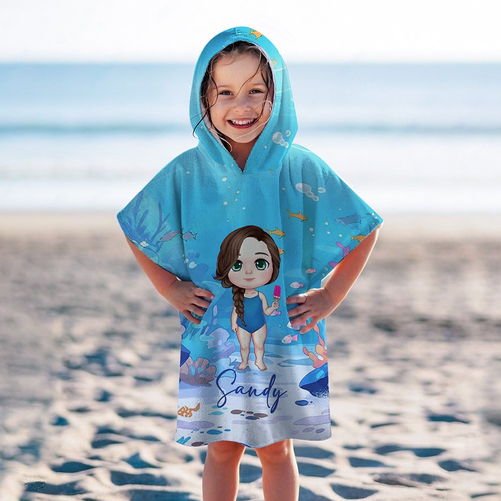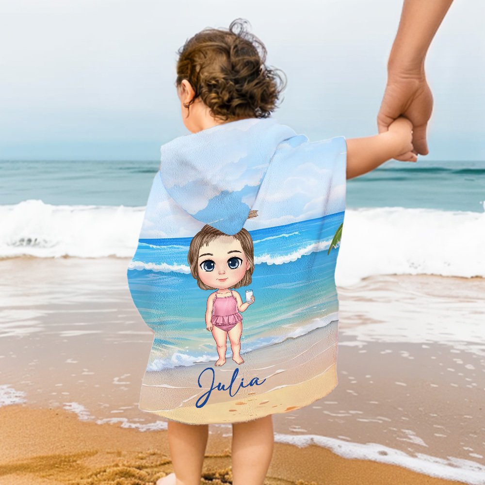 This hooded beach towel features an adorable cartoon character based on your child’s image, perfectly blending playfulness with style. Set against a dreamy underwater scene or a vibrant beach backdrop, it creates a whimsical oceanic world that evokes a relaxing vacation vibe. You can even Personalise it with your child’s name to reflect their unique personality.