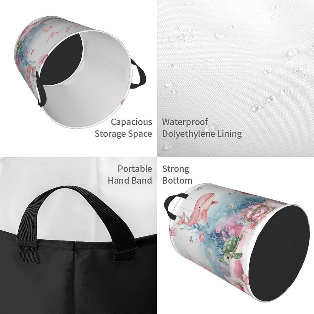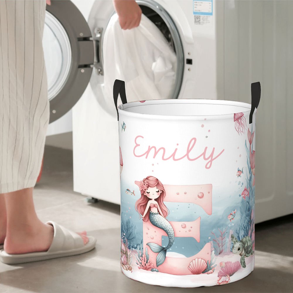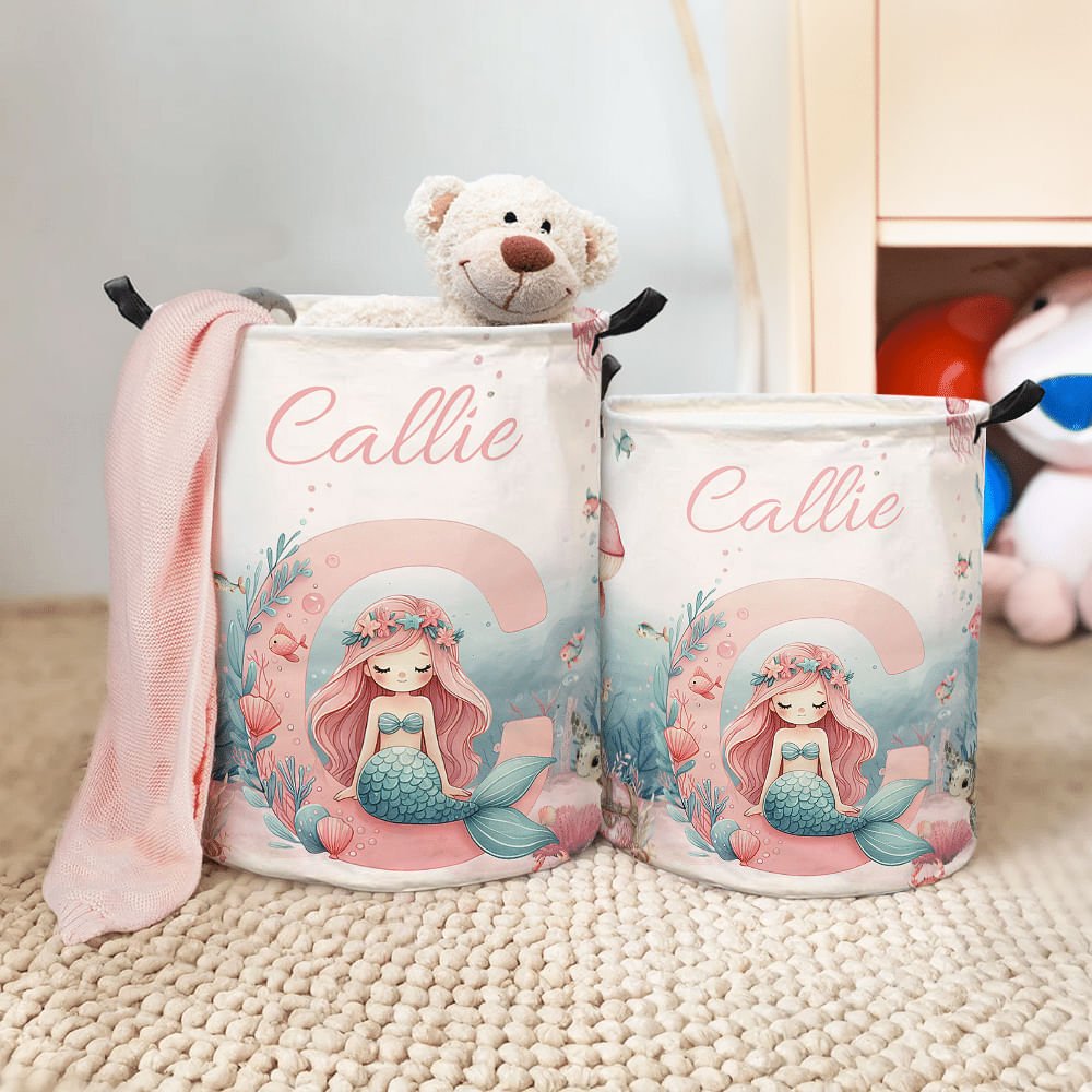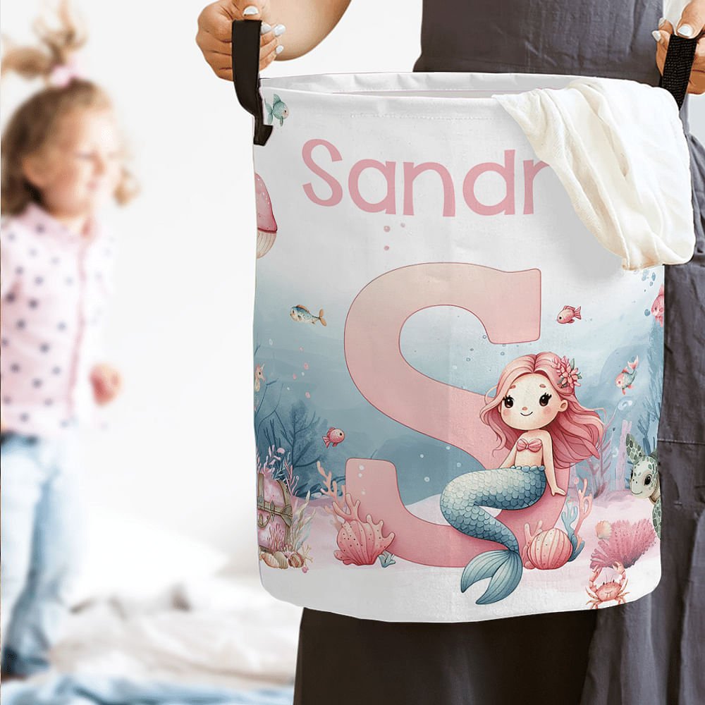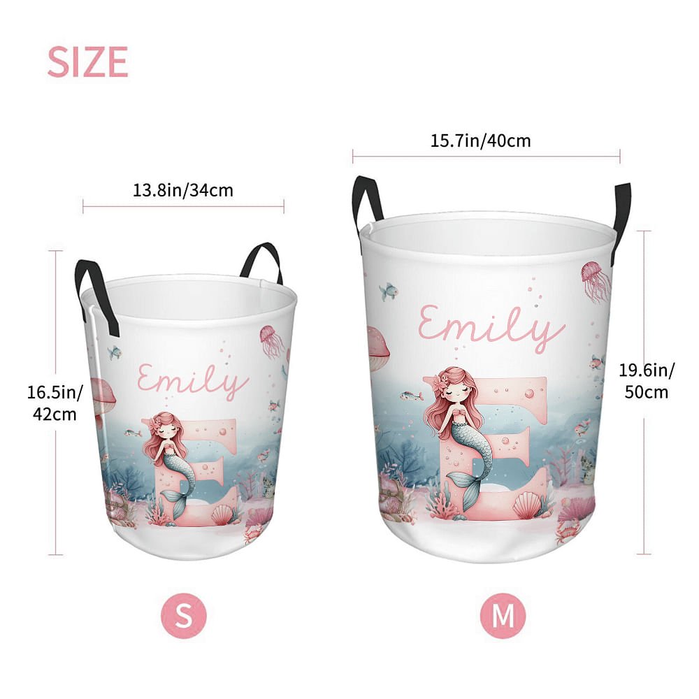 Our custom mermaid design is charming. It shows lively mermaid cartoon characters with shimmery tails, flowing hair, and playful eyes. A chosen name, like a user's or a loved one's, is artistically added to this basket, making it a unique item.