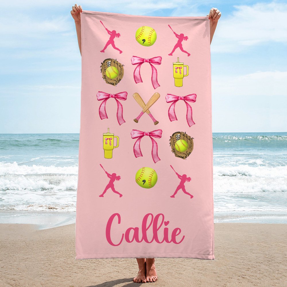This oversized beach towel features a delightful combination of softball or baseball patterns, accented with a stylish coquette bow. Personalise the towel with a name for an extra special touch. This customization enhances its uniqueness and helps kids easily identify their towels.